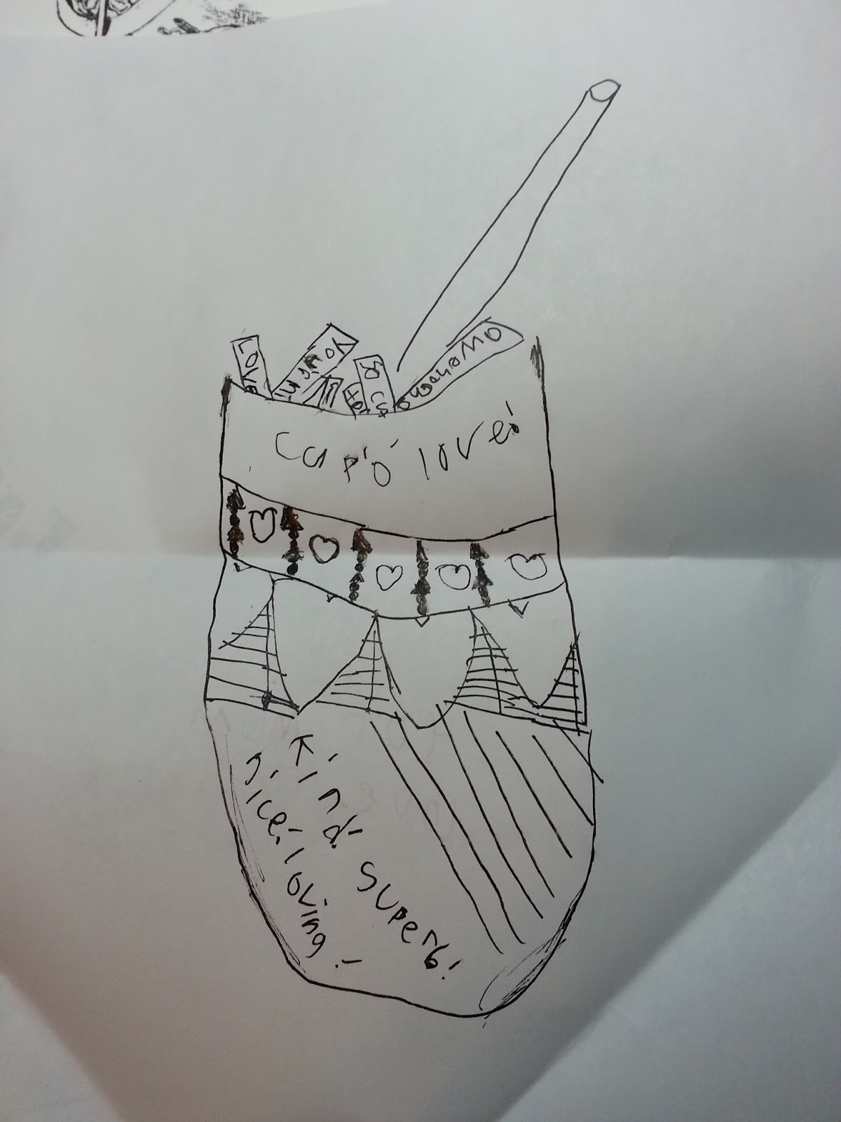 My fab son Zachary saw what I was doing and made his own version of Zentangling! Isn't it so cute!!?! It is a "Cup of love" and it says "kind, super, nice, loving" at the bottom and the ice cubes all say things like "love" and "awesome". He us such a sweetie!!